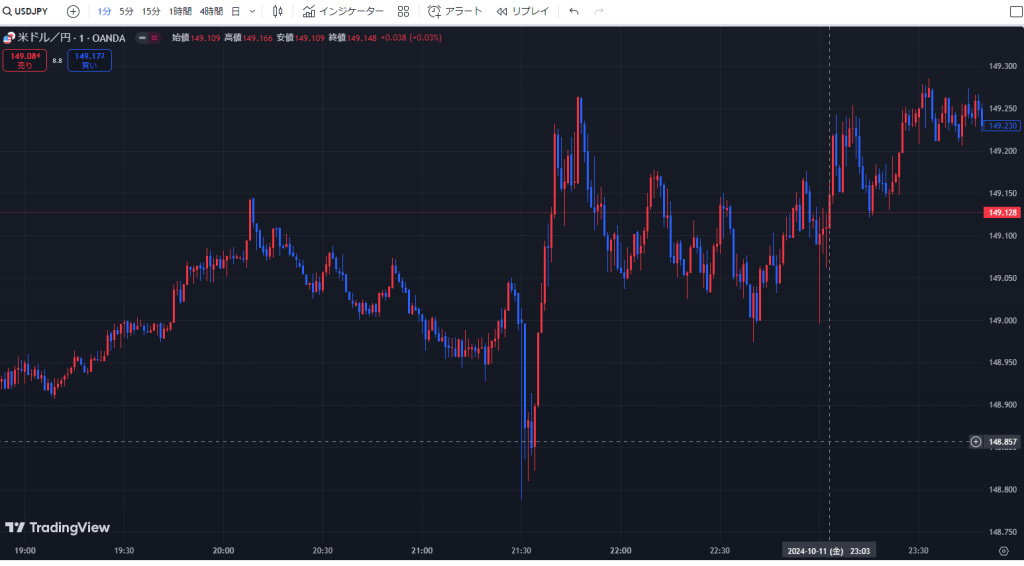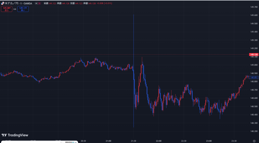 下落してから反発し、高値をつけますが徐々に下落。指標前の値段に戻ってから上昇していきました。