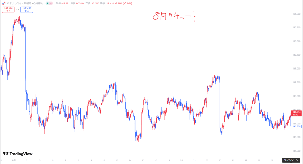 8月は最初からトレンドが発生することはなく、下げては押して下げては押して。円安方向に伸びるのかな?と思ったら、米指標がすこぶる悪く米金利が利下げから円高に進むがまた押してとリバがきつい一カ月となりました。